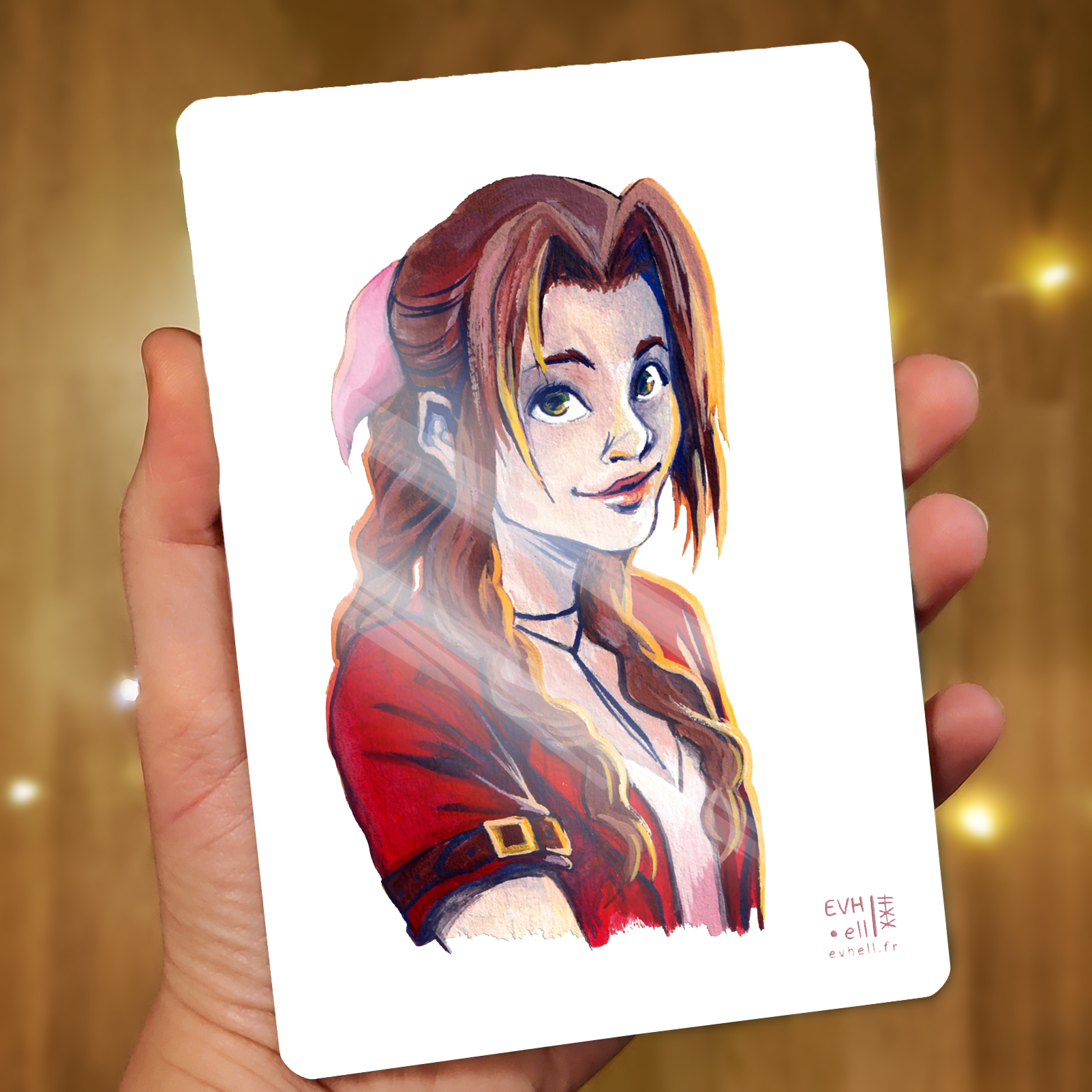 Hommage à Aerith, personnage de Final Fantasy VII. Impression de qualité avec vernis sélectif en relief qui fait ressortir les couleurs.